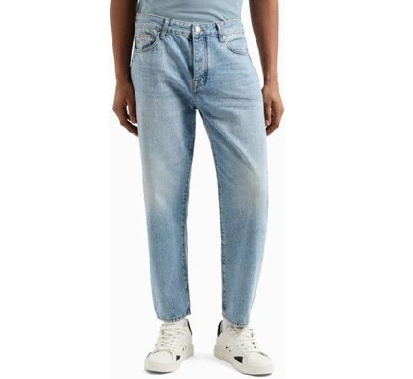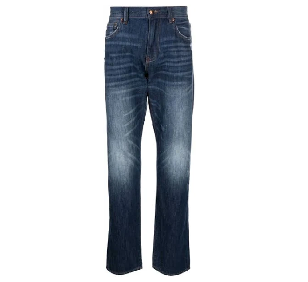 The design includes a mid-waist rise and a straight leg style. For practicality, they feature cargo pockets in addition to the standard five-pocket styling. The closure is a button fly. These jeans are presented with a clean look, meaning they are not distressed.