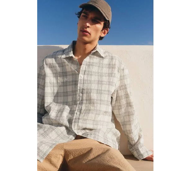 Men’s Checked Loose Fit Textured Shirt. Made from breathable textured cotton poplin, it features a stylish checked pattern and a comfortable Loose Fit for a modern, relaxed silhouette. Complete with a turn-down collar and long sleeves with buttoned cuffs, it’s perfect for effortless everyday styling in Ghaziabad. Its unique texture and versatile design make it a standout addition to any casual wardrobe.