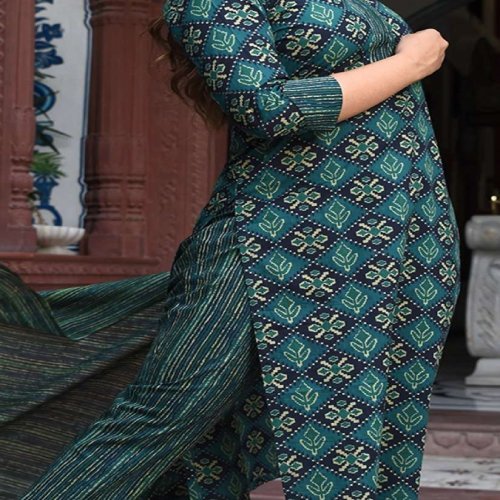 This beautiful Printed Cotton Straight Kurti Pant and Dupatta Set from is suitable for all ocassions. This ethnic outfit with attractive lace will look trendy as casual party wear, festive wear and also on religious ceremonies and weddings. It also gives a formal look perfect for office wear. It gives a great feel as it is made of blend cotton fabric. It has got the classic neck look which makes women feel stylish.
